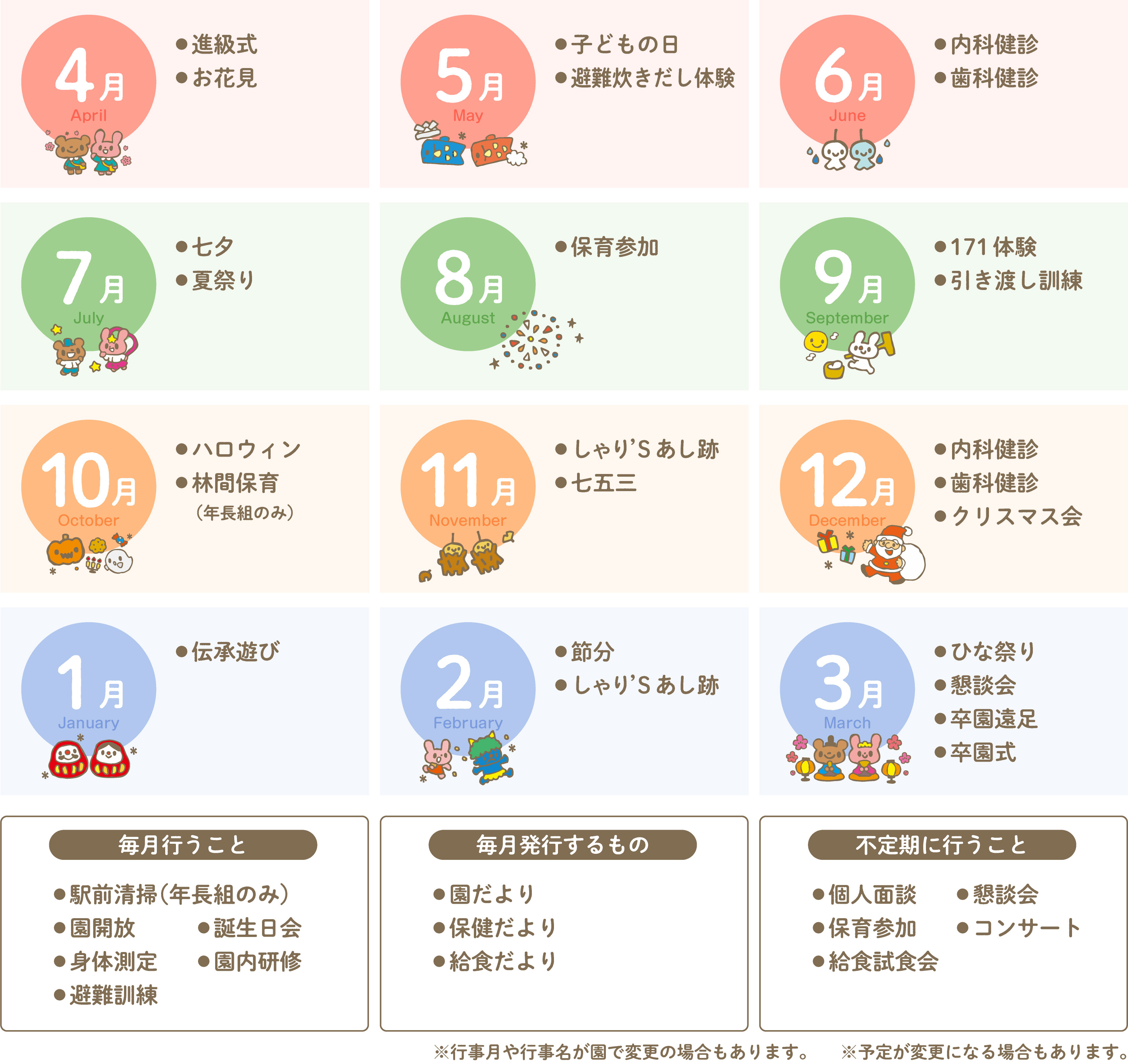 ▼1日の流れ ▼給食とおやつ ▼年間行事 ▼そのほかの必要事項など ▼おさんぽマップ